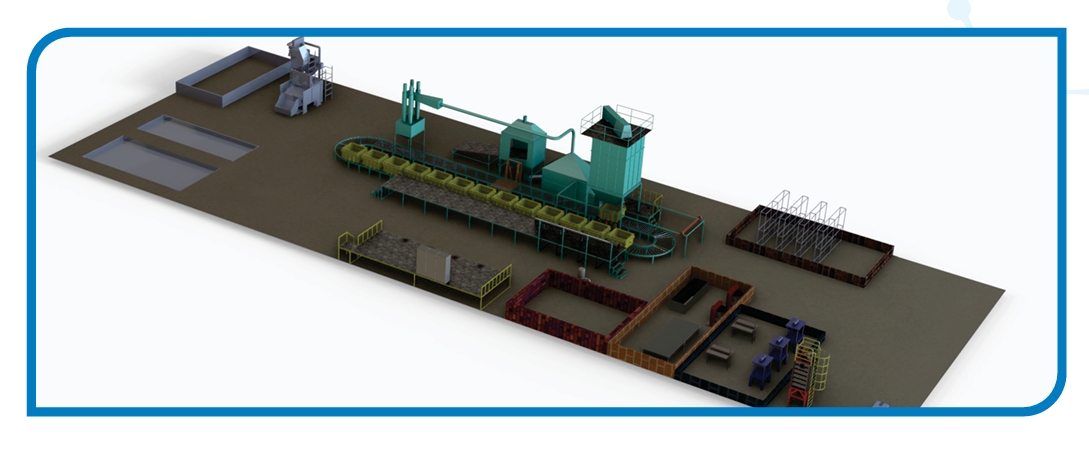 Flask Dump Station: Sand and metal separation occurs at the Flask Dump Station. Due to the absence of binders in the sand, this process is executed effortlessly. Systems can be designed to accommodate quenching operations if necessary.